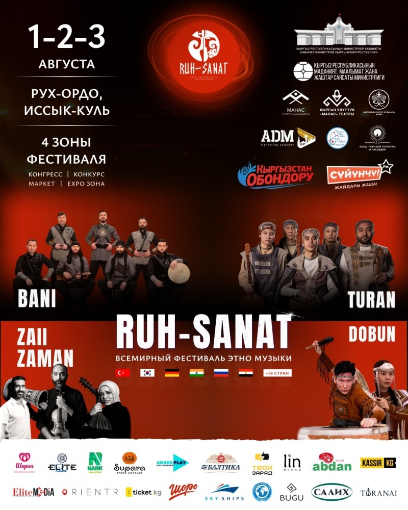 BANI (Грузия)Мужская полифония, энергетика современного шоу и голоса, способные пробраться под кожу. Их песни в чартах, а выступления - на крупнейших сценах мира.TURAN (Казахстан)Более 20 древних казахских инструментов, эпические кюи и театральное этно-шоу. Эти музыканты - культурные послы страны, которые уже покорили зрителей от Нью-Йорка до Токио.ZAII ZAMAN (Египет)Погружение в атмосферу арабского Золотого века - макамы, редкие мелодии Востока и инструментальная магия. Под звёздным небом Иссык-Куля она будет особенно чарующей.ДОБУН (Россия, Республика Саха)Шаманские барабаны, хомус, ритмы вечной мерзлоты - голос земли и духа северных народов, который не спутать ни с чем.IPEK YOLU ("Шелковый путь", Турция)Музыка, объединяющая тюркский мир. Отголоски древности, редкие инструменты и новые интерпретации мелодий, вдохновленных наследием Великого Шелкового пути.