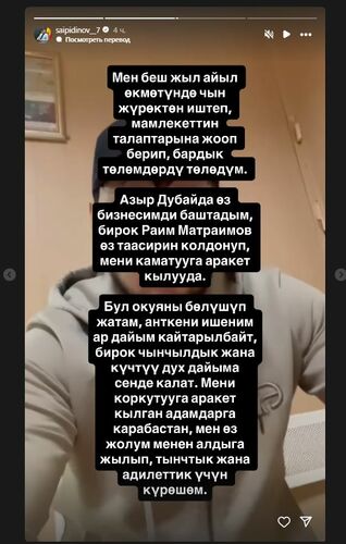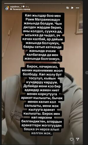 "Я считаю, что это часть действий, предпринимаемых против меня Раимбеком Матраимовым. Дело в том, что мне известны многие из его скрытых дел - в том числе факты, связанные со смертью Айеркена Саймаити, журналиста Улана Эгизбаева и другие. По моему убеждению, Раимбек Матраимов стремится устранить меня, чтобы эти сведения не стали достоянием общественности. Я не доверяю сотрудникам милиции, поскольку считаю, что среди них есть лица, связанные с Раимбеком Матраимовым", - отметил Мунарбек Сайпидинов.