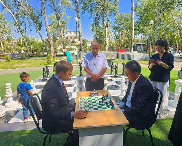 Шахматный праздник состоялся и в Джалал-Абаде. Здесь организовали партию между юными шахматистами Айбийке Коконбаевой (2012 года рождения) и Элмирбеком Ашимовым (2015 года рождения) и дуэтом Сергей Карякин и Николай Валуев.