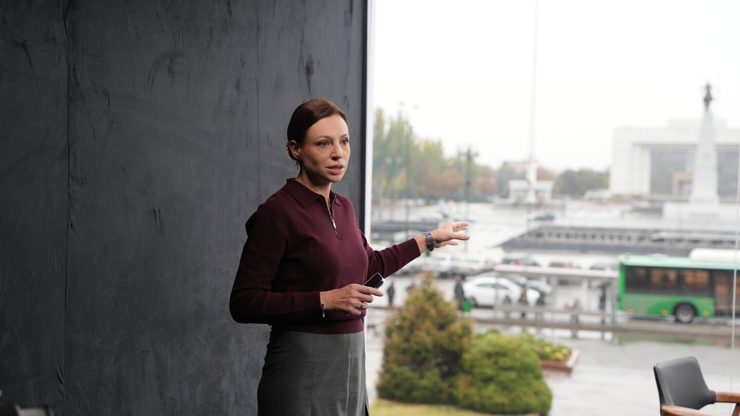Главный редактор телеканала "Номад-ТВ" Наталья Кролевич показала журналистам пиксельную студию, установленную в центре Бишкека у южной стороны площади Ала-Тоо, и рассказала, для чего она появилась именно здесь.