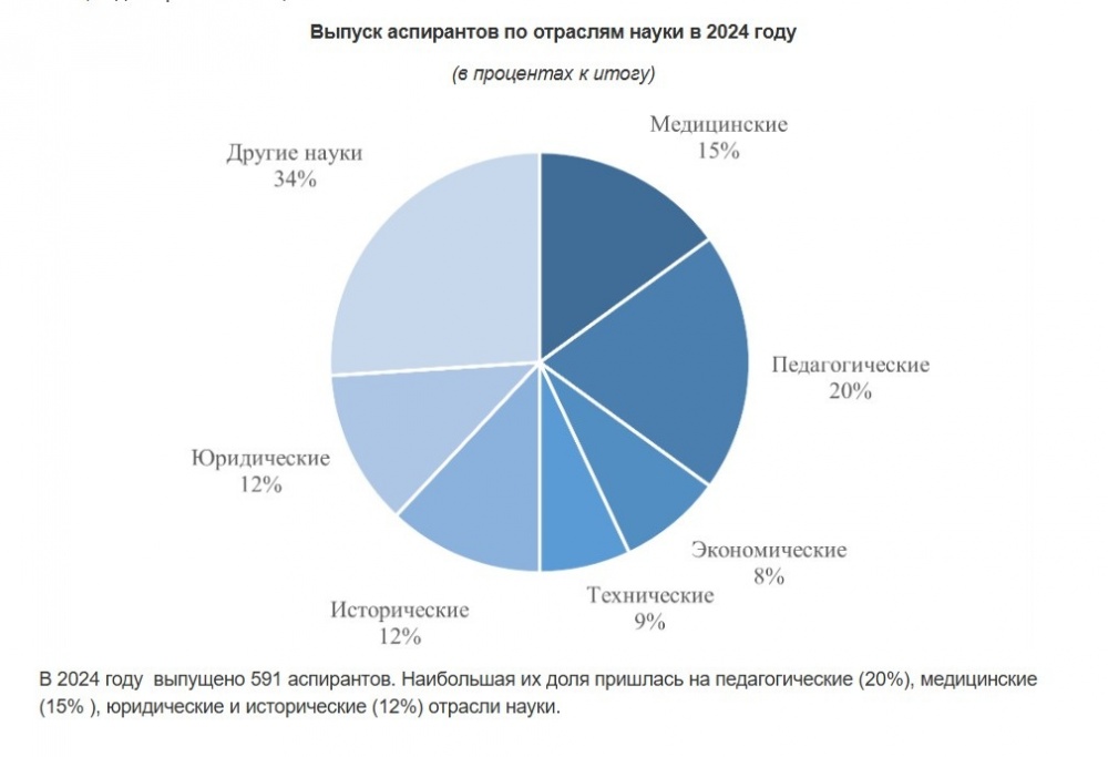Численность аспирантов в 2024 году составила 2,4 тыс. человек, наибольшая доля из которых пришлась на медицинские (24%), педагогические (16%), юридические (13%) и экономические (8%) отрасли науки. Численность докторантов составила 623 человека. Доля женщин в общей численности аспирантов превысила 60%, а доля женщин докторантов в общем их числе составила около 60%.