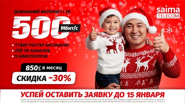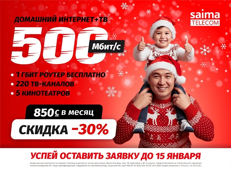 Акция актуальна до 15.01.26 г. для новых абонентов (физ. лиц). Скидка действует первые 3 месяца. Оборудование предоставляется на ответственное хранение гражданам КР. Подробности на saimatelecom.kg. Лицензия ГАС при ГКИТиС КР №03-292-КР от 24.11.2003.