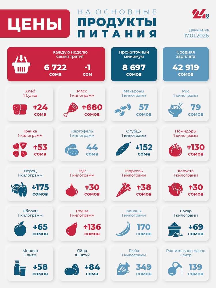 Продуктовая корзина 24.kg 24.kg продолжает еженедельный мониторинг цен на минимальный набор продуктов. За последнюю неделю стоимость минимального набора продуктов снизилась на 1 сом - до 6 тысяч 722 сома.