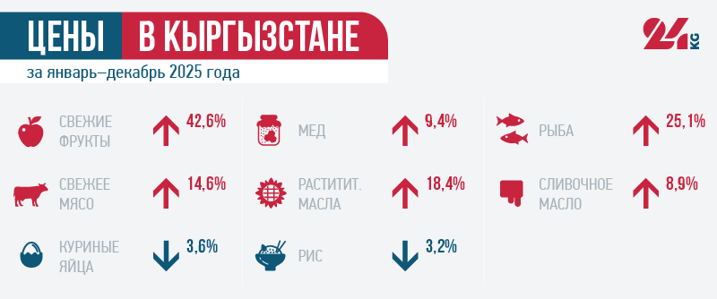 Анализ показывает, что с начала нашего эксперимента в конце октября 2018 года стоимость продуктовой корзины выросла на 3 тысячи 452 сома. С начала 2026 года она подешевела на 1 сом, а по сравнению с аналогичным периодом 2025-го подорожала на 710 сомов.