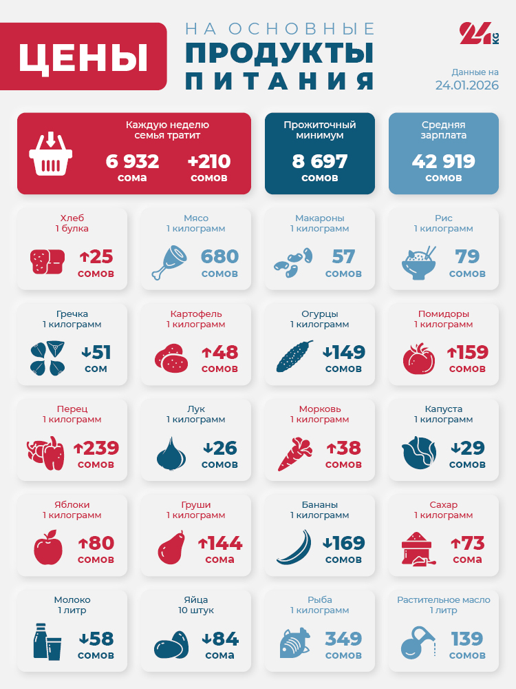 Читайте по теме Продуктовая корзина Бишкека на 17 января. Что подорожало больше всего В итоге стоимость минимального набора продуктов выросла на 210 сомов - до 6 тысяч 932 сома.