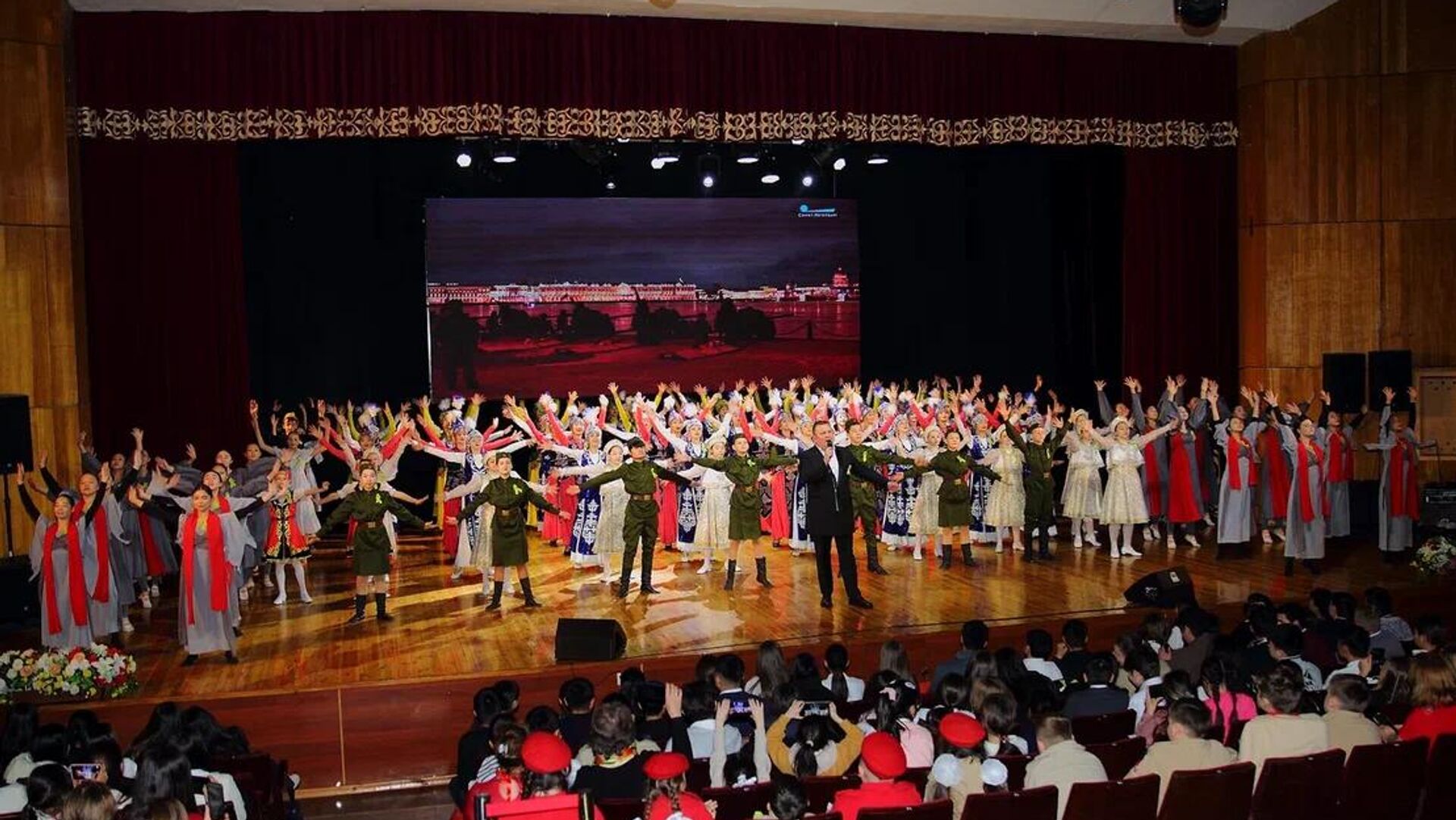 В Национальном центре детей и юношества "Сейтек" состоялось масштабное и трогательное действие. Более 150 именитых и молодых артистов рассказали 700 школьникам, студентам и курсантам военных учебных заведений историю страшных дней блокады, участия кыргызстанцев в защите города и спасении его жителей.