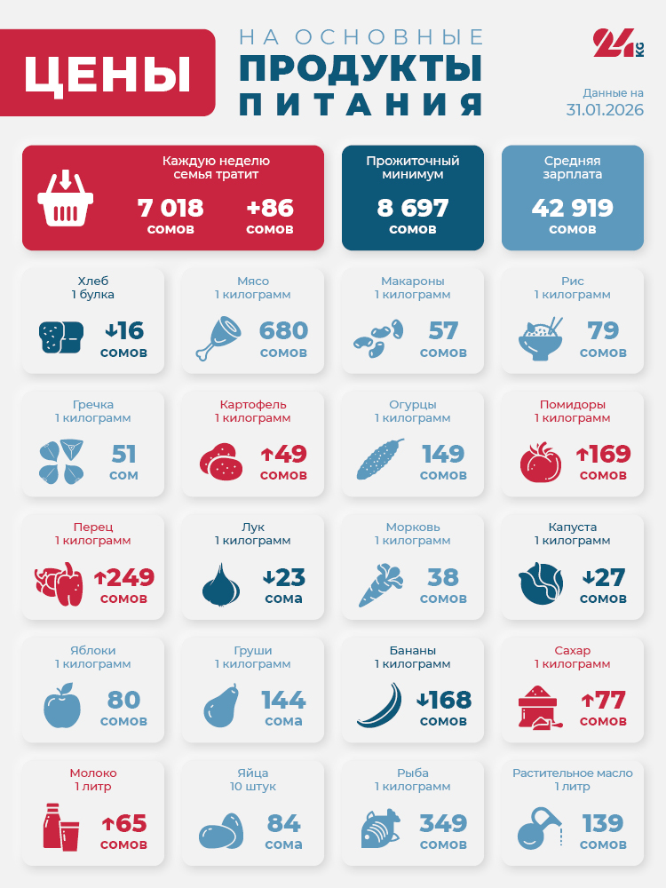 Читайте по теме Продуктовая корзина Бишкека на 24 января. Что подорожало больше всего В итоге стоимость минимального набора продуктов выросла на 86 сомов - до 7 тысяч 18 сомов.