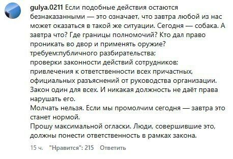 - "Если подобные действия остаются безнаказанными, это означает, что завтра любой из нас может оказаться в такой же ситуации. Сегодня - собака. А завтра что? Где границы полномочий?" - пишут в соцсетях.