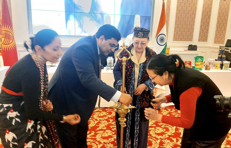 Мероприятие началось с традиционного зажжения церемониальной лампы, символизирующей изгнание тьмы, гармонию и спокойствие. В церемонии приняли участие Чрезвычайный и Полномочный Посол Индии в Кыргызстане Бирендер Сингх Ядав, глава Конгресса женщин в Кыргызстане Замира Акбагышева и другие приглашенные гости.