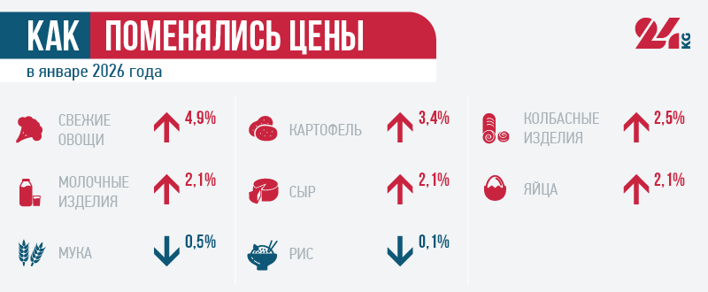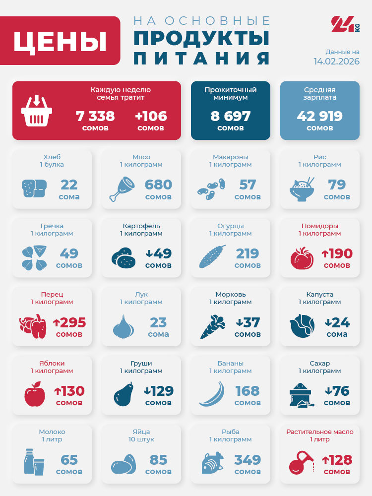 Анализ показывает, что с начала нашего эксперимента в конце октября 2018-го цена продуктовой корзины выросла на 4 тысячи 68 сомов. С начала 2026 года она подорожала на 615 сомов, а по сравнению с аналогичным периодом 2025-го - на 1 тысячу 272 сома.
