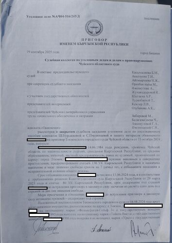 На эту кассацию мы обжалование не подавали, поскольку не знали, что нужно это делать. Наш госадвокат нам объяснил, что переживать не стоит, мы уже выиграли, кассация проверяет только процессуальные ошибки, а их в деле, по его словам, нет. Вообще наш государственный адвокат ничего не делал, мы с детьми сами писали какие-то ходатайства, обжалования. Но после того как он заверил, что все будет хорошо, мы с детьми расслабились. Нам сказали, что нас вызовут в Верховный суд, мы ждали. Но в начале февраля 2026 года адвокат сообщил, что наше дело снова в Токмоке. Оказалось, что заседание в ВС КР провели без нас, явно нарушив права моих детей и меня. Нас даже не оповестили, когда состоится заседание. Мы с дочерью всегда добросовестно приезжали на все суды, а в этот раз даже не дали сказать нам слово", - посетовала женщина.