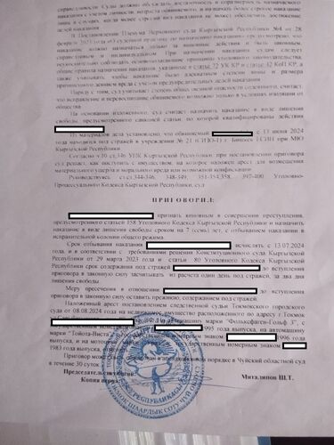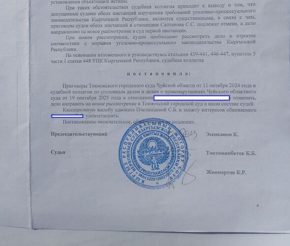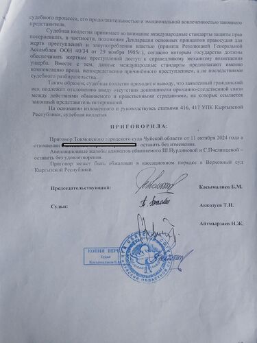"Суды первой инстанции длились около полугода, его осудили на семь лет по статьям 158 (развратные действия) и 34 (продолжаемое преступление). У стороны ответчика за это время поменялось три адвоката, меня с детьми защищает государственный. Они подали апелляцию в областной суд, было более 12 заседаний. Один раз полностью поменялся состав судей. В итоге облсуд оставил приговор первой инстанции без изменений. С.С. отправили в колонию № 10 в Джалал-Абаде. Он просидел всего несколько месяцев, а потом его адвокат подал кассацию в Верховный суд - просил отменить приговор Токмокского городского суда, а материалы уголовного дела направить в Чуйский областной суд для нового рассмотрения.
