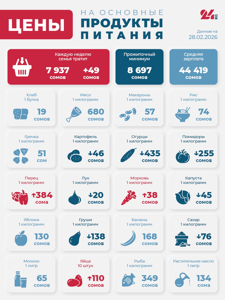 Читайте по теме Продуктовая корзина Бишкека на 21 февраля. Что подорожало больше всего В итоге стоимость минимального набора продуктов за неделю выросла на 49 сомов - до 7 тысяч 937 сомов.