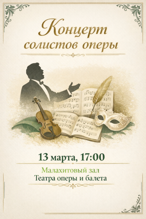 13 марта. Концерт солистов оперы Для зрителей прозвучат популярные произведения зарубежной, русской и национальной классики. Вас ждет многоцветное пиршество изумительных по красоте мелодий, поющих бесконечный и величественный гимн любви, красоте и гармонии.