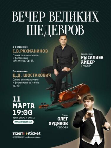 10-11 марта. Концерт "Шедевры мировой классики" Прозвучат выдающиеся произведения мировой симфонической музыки в исполнении ведущих музыкантов и приглашенных солистов. Выступят артист Национального филармонического оркестра России Айдер Рысалиев (виолончель), лауреат международного конкурса Олег Худяков (рояль), главный дирижер оркестра - Урмат Тентимишов.