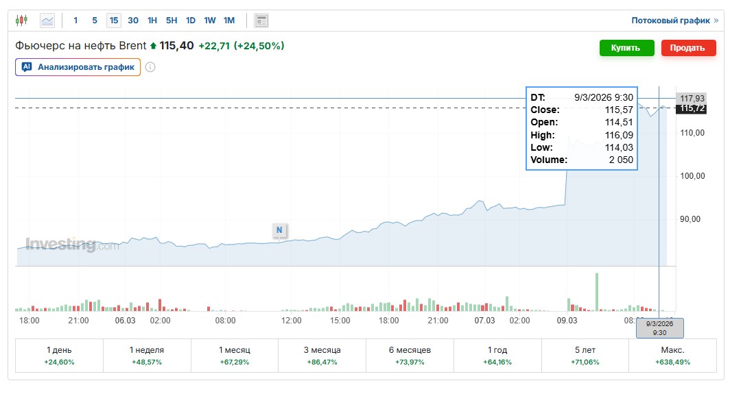 Цены на нефть активно растут на фоне резкого усиления геополитической напряженности на Ближнем Востоке. Сегодня фьючерсы на нефть марки Brent с поставкой в мае на лондонской бирже ICE прибавили 23 процента и достигли отметки $115,69 за баррель. Это значение стало локальным максимумом за последние несколько лет, в частности с 5 июля 2022 года.