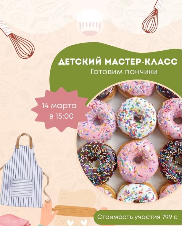 14 марта. Мастер-класс по приготовлению пончиков Дети будут творить, учиться и получать удовольствие от процесса. Они сделают пончики. Регистрация по телефону 0558193333.