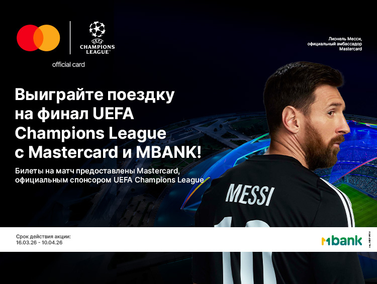 В честь запуска Mastercard и MBANK проводят масштабную акцию: клиенты, оформившие предзаказ карты Messi Mastercard Gold через мобильное приложение MBANK с 16 марта по 10 апреля 2026 года, автоматически участвуют в розыгрыше. Главный приз - поездка для двоих на финал Лиги чемпионов УЕФА - 2026 в Будапеште.