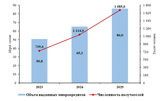 Спрос на микрокредиты растет По данным Национального статистического комитета, в 2025 году микрокредитные организации в Кыргызстане выдали 86 миллиардов сомов займов. Число получателей достигло почти 1,7 миллиона человек. По сравнению с 2024-м число охваченных микрокредитованием увеличилось в 1,5 раза, а объем выданных денег - почти на 32 процента.