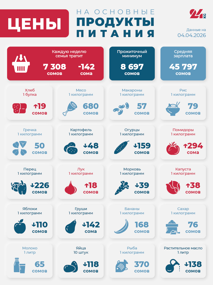 Читайте по теме Продуктовая корзина Бишкека на 28 марта. Подорожали груши, подешевели овощи В итоге стоимость минимального набора продуктов снизилась на 142 сома - до 7 тысяч 308 сомов.
