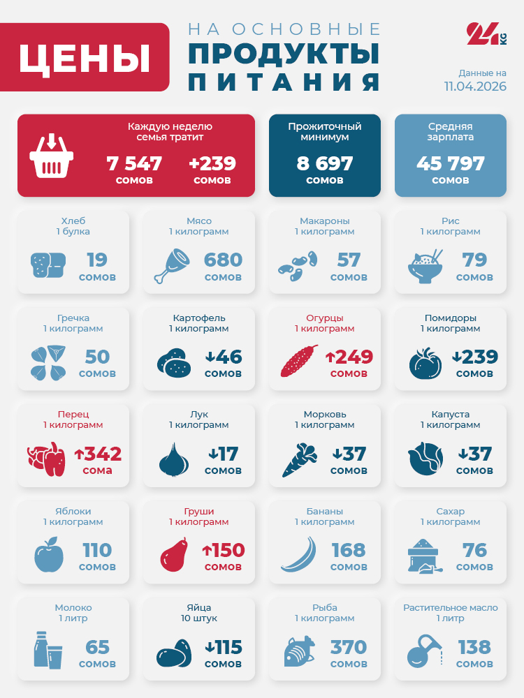 Читайте по теме Продуктовая корзина Бишкека на 4 апреля. Что подорожало больше всего В итоге стоимость минимального набора продуктов выросла на 239 сомов - до 7 тысяч 547 сомов.