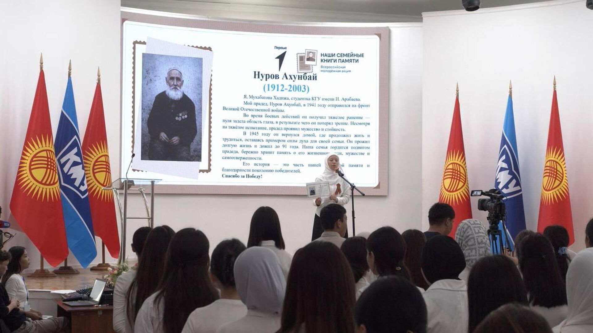 "Для образовательных организаций Кыргызстана инициированная в России акция "Наши семейные книги памяти" стала уже традиционной. Она проходит одновременно в Бишкеке и Ярославле. Важно, чтобы молодые люди понимали, что именно единство наших народов помогло победить в той страшной войне. Значимость близости кыргызов и россиян невозможно переоценить", — отметила ректор КГУ им. И. Арабаева Айгуль Абдраева.