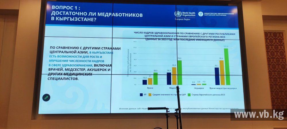 Один из вызовов в кыргызской системе здравоохранения - это дефицит медицинских кадров, в которой не хватает более 20 тысяч медицинских работников: около 6,5 тысячи врачей и 8,5 тысячи - медсестёр. В дефиците санитарные работники и специалисты для технического обслуживания. И есть риск, что кадровый голод будет увеличиваться. По крайней мере, такая тенденция прослеживается, судя по прошедшему диалогу высокого уровня по кадровым ресурсам здравоохранения.