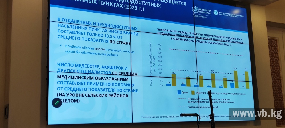 И по данным анализа, тенденция снижения численности медработников в системе здравоохранения приобретает устойчивый характер. С 2013 года общее число медицинских работников сократилось более чем на 18 процентов, врачей - на 19 с лишним, количество медсестер снизилось почти на 17, а акушерок - примерно на 35 процентов. Заведующая отделом образования Министерства здравоохранения Зуура Долонбаева отметила, что сложившаяся ситуация свидетельствует о наличии системных проблем в кадровом обеспечении. По ее мнению, эта тенденция связана с миграцией персонала, высокой нагрузкой и сложными условиями труда в больницах. Она также подчеркнула, что распределение медицинских работников по регионам крайне неравномерное. Наибольшее число врачей сосредоточено в Бишкеке и Оше, где их почти вдвое больше, чем в Таласской и Чуйской областях. Количество же медсестер и акушерок в Баткенской области вдвое больше, чем в Бишкеке, Чуйской и Иссык-Кульской областях.
