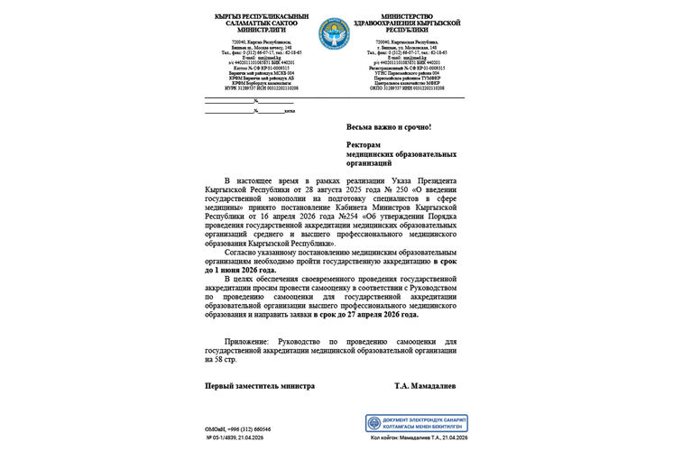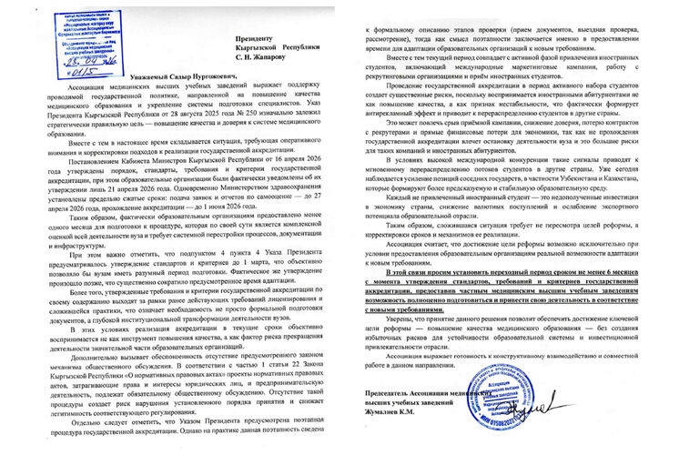 Авторы обращения просят Садыра Жапарова установить переходный период сроком не менее шести месяцев с момента утверждения стандартов, требований и критериев государственной аккредитации, предоставив частным медицинским высшим учебным заведениям возможность полноценно подготовиться и привести свою деятельность в соответствие с новыми требованиями.