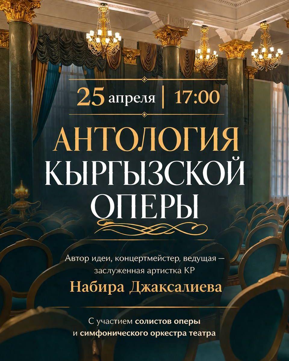 25 апреля. Концерт "Антология кыргызской оперы" Шедевры национальной классики - арии и дуэты из опер "Ай-Чурок" "Манас", "Токтогул", "Ажал ордуна", "Сепил", "Аста секин, колукту!", "Олжобай и Кишимжан", "Ак-моор" прозвучат в исполнении солистов оперы и симфонического оркестра театра.
