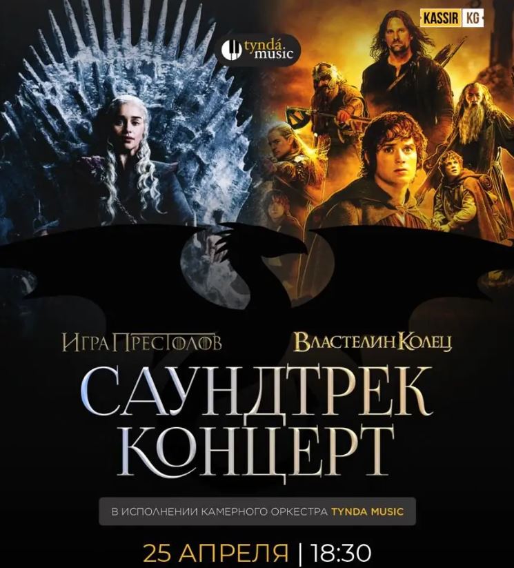25 апреля. Саундтрек-концерт Погрузитесь в магию и величие фэнтези-миров на уникальном концерте камерного оркестра Tynda Music. В этом захватывающем музыкальном событии вы сможете окунуться в эпические звучания легендарных саундтреков из "Игры Престолов" и "Властелина Колец".
