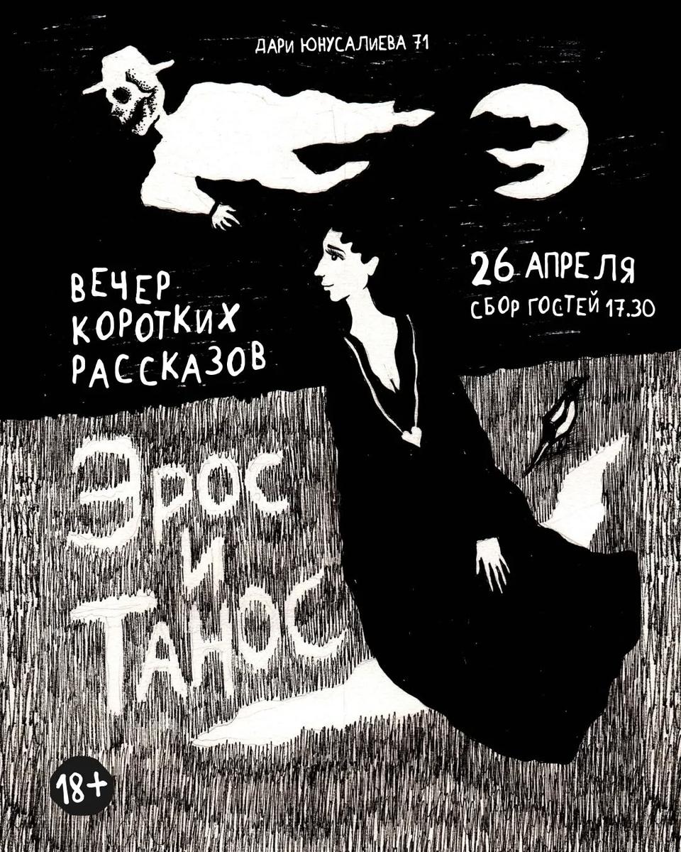 26 апреля. Вечер коротких рассказов "Эрос и Танос" В программе прозвучат короткие рассказы: Ги де Мопассана, Владимира Сорокина, Айрис Мердок, Линор Горалик, Этгара Керета и даже отрывок из "Божественной комедии" Данте, - все это в формате читки в исполнении Антона Казаковцева и Вероники Шереметьевой. В перерывах между рассказами будет живая музыка под гитару от Тимура Сарбасова.