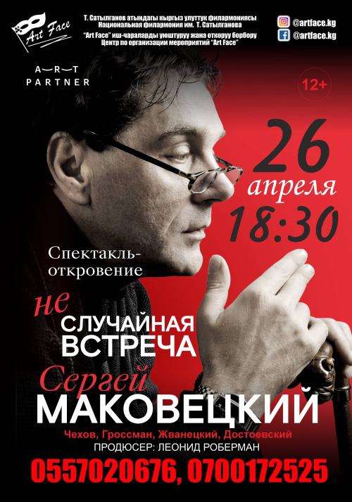 26 апреля. Спектакль "Неслучайная встреча" Во время моноспектакля зрители услышат рассказы о работе в кино и театре, о встречах с интересными режиссерами, актерами и другими людьми, которые оставили след в жизни и творчестве артиста. В программе прозвучат монологи из спектаклей и поэзия, будут демонстрироваться редкие кадры из короткометражных кинофильмов. В ролях Народный артист России Сергей Маковецкий.