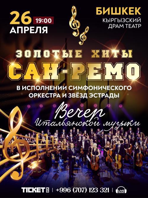 26 апреля. Концерт "Вечер итальянской музыки" Приглашаем вас окунуться в атмосферу легендарного фестиваля "Сан-Ремо" вместе с симфоническим оркестром, солистов оперы и звезд эстрады. Вас ждут самые яркие и любимые песни и мелодии победителей фестиваля: Адриано Челентано, Тото Кутунньо, Аль Бано и Ромина Пауэр, Рикки и Повери, Андреа Бочелли, Джанни Моранди, Эрос Рамазотти и других исполнителей.