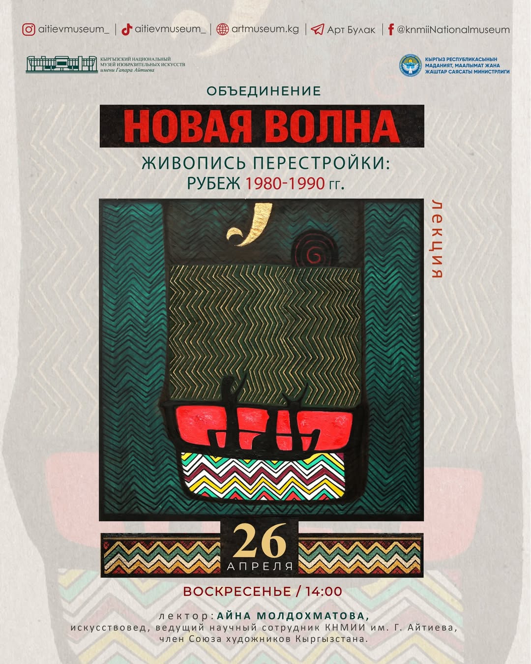 Лекции, мастер-классы 25 апреля. Лекция "Объединение "Новая волна"" На лекции мы обсудим темы и образы, содержательный смысл ряда экспонатов этих нашумевших выставок. Для некоторых участников "Новой волны" данный этап их творческой биографии оказался самым плодотворным. Лектор: искусствовед Айна Молдохматова,.