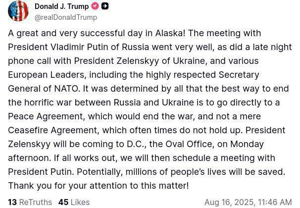 "Прекрасный и очень успешный день на Аляске! Встреча с президентом России Владимиром Путиным прошла очень хорошо, как и ночной телефонный разговор с президентом Украины Владимиром Зеленским и различными европейскими лидерами, включая высокоуважаемого генерального секретаря НАТО", - написал в своей соцсети Truth Social президент США.