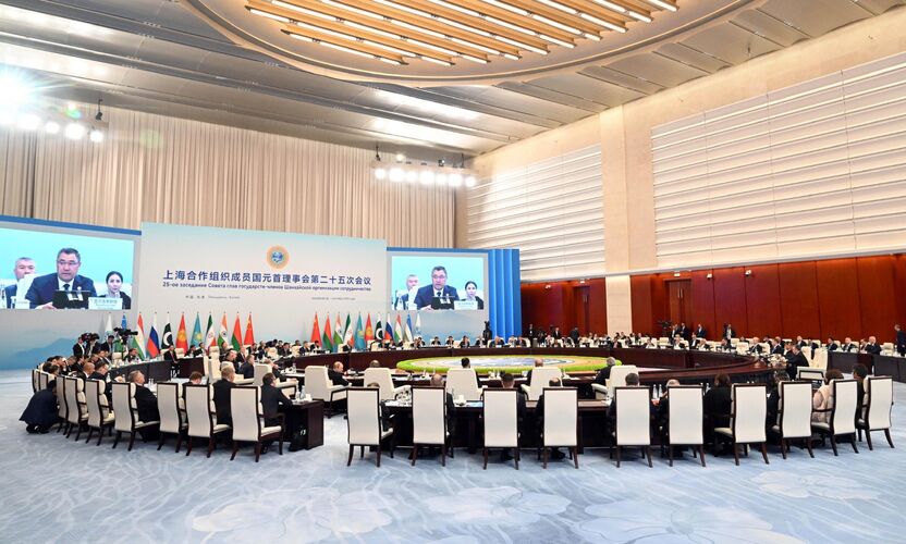 Президент Садыр Жапаров сегодня в рамках рабочего визита в Китайскую Народную Республику выступил на 25-м заседании Совета глав государств - членов Шанхайской организации сотрудничества в Тяньцзине.