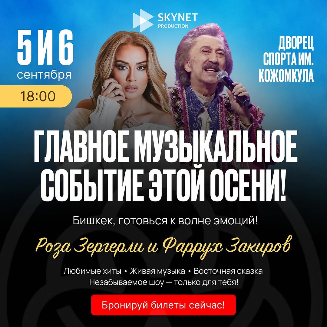 6 сентября. Концерт На одной сцене выступят легендарный Фаррух Закиров и неповторимая Роза Зергерли. Вас ждут восточная магия, любимые хиты и эмоции, которые останутся в сердце надолго.