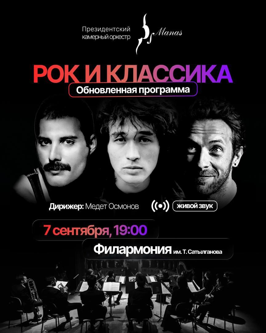 7 сентября. Концерт "Рок и классика" Президентский оркестр "Манас" под управлением Медета Осмонова вновь объединит, казалось бы, несовместимое: мощь рок-легенд и глубину классического искусства.