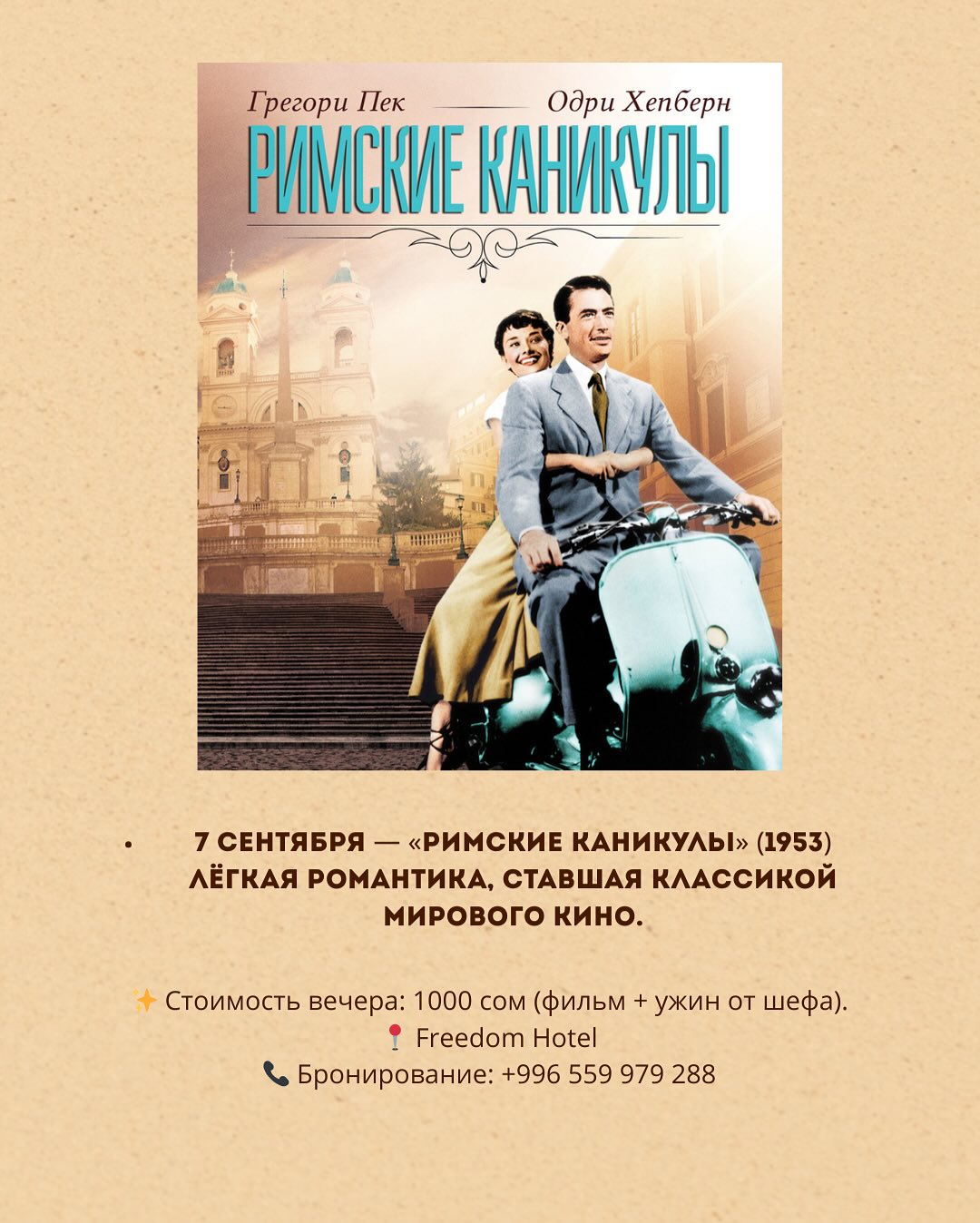31 августа. Киноужин Атмосфера уюта, вкусный ужин и отличный фильм - каждое воскресенье. В этот раз покажут фильм "Римские каникулы".