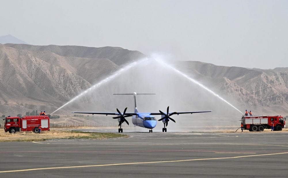 Первый самолёт в Нарыне встретили традиционной водяной аркой. После вступительного слова главы государства гости смогли осмотреть здание аэропорта.
