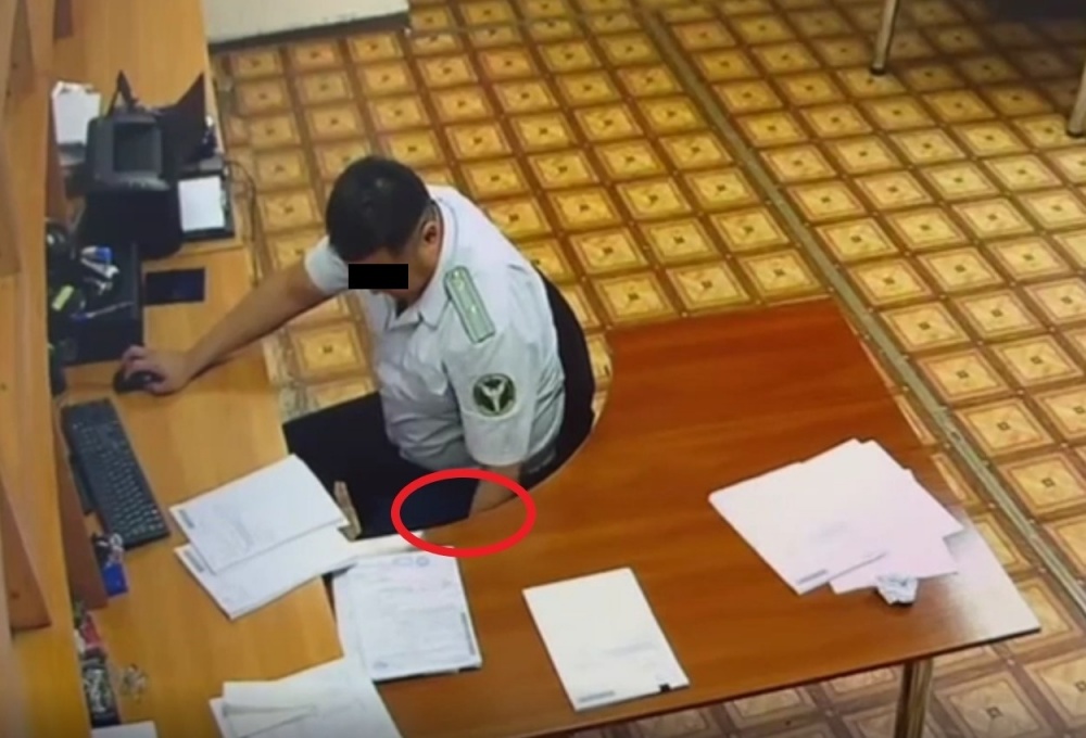 В результате оперативно-технических мероприятий были зафиксированы видеоматериалы, на которых таможенные инспекторы получали денежные средства в размере от 3 до 5 тысяч сомов вместе с декларациями и другими документами, после чего клали деньги в карманы форменной одежды.