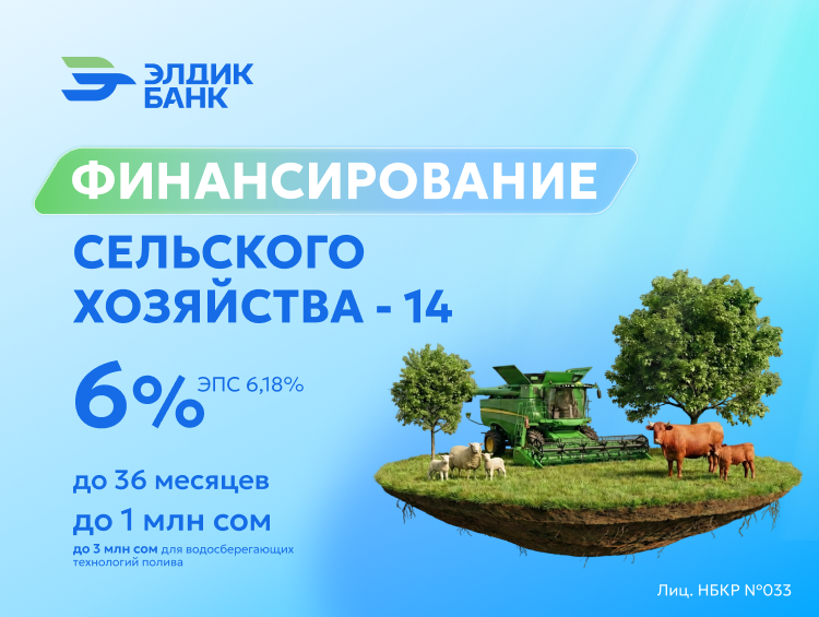 "Элдик Банк" объявляет о запуске программы "Финансирование сельского хозяйства - 14" (ФСХ-14), направленной на поддержку субъектов предпринимательства, осуществляющих деятельность в сфере агропромышленного комплекса.
