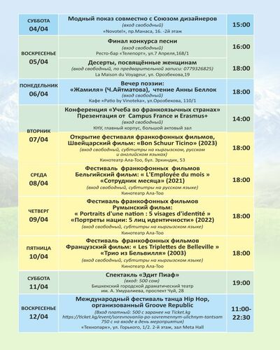 - Кинофестиваль: С 7 по 10 апреля в кинотеатре "Ала-Тоо" впервые покажут фильмы из Швейцарии, Франции, Бельгии и Румынии. Откроет показ швейцарская лента "Бон шуур Тичино" (7 апреля в 18.00).