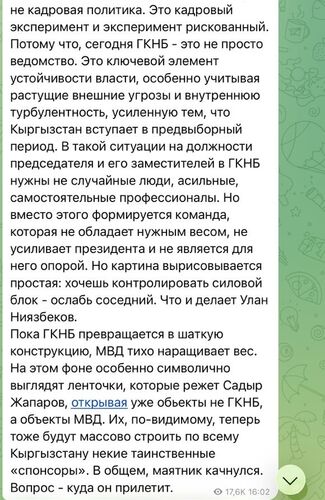 В последнее время в информационном пространстве и соцсетях распространяются публикации, содержащие критику кадровых решений в силовом блоке Кыргызстана. В связи с появлением непроверенных сведений Государственный комитет национальной безопасности считает необходимым внести ясность и представить официальную позицию.