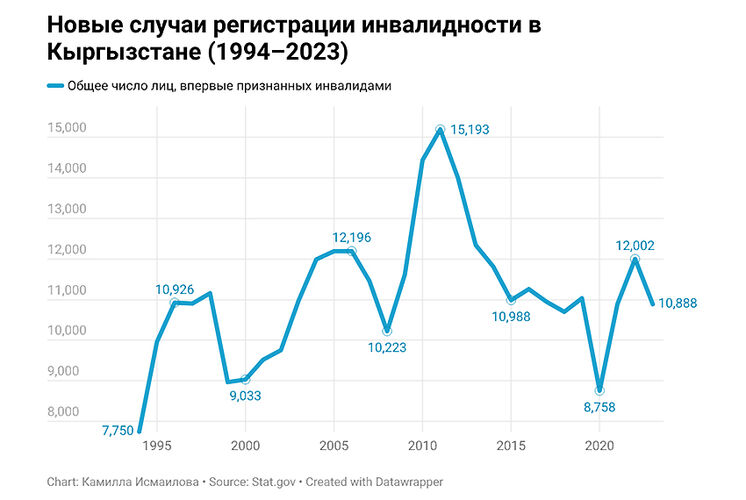 Рост числа детей с инвалидностью По официальным данным, в 1980 году в Киргизской ССР зарегистрировано около 1 тысячи 300 детей с инвалидностью. К 1990-му это число увеличилось в четыре раза. После распада СССР показатели продолжили расти: ежегодно тысячи людей впервые признавались инвалидами.